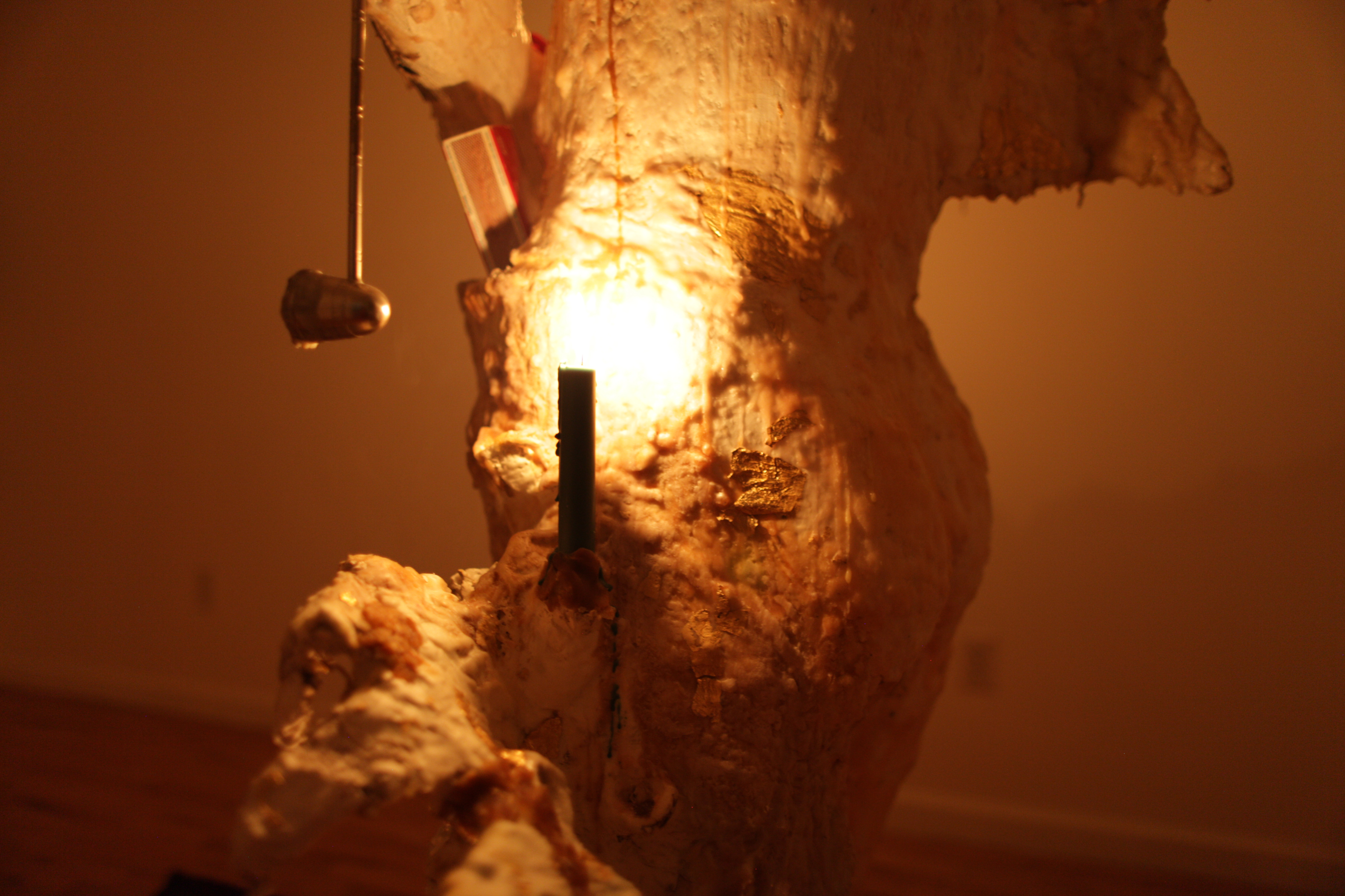Illuminator is an exhibition by Laura Bernstein composed of new sculpture with painting, works on paper and video. In this installation, Bernstein works within the liminal space of pictures and words while drawing on the imagery of anonymous authors who illuminated medieval manuscripts. Illuminator centers itself around a sexless wing finned figure, embedded with candles and barnacles--a humanoid candelabra--dripping, melting and congealing fleshy, gilded wax. Though the monks and nuns who illuminated manuscripts were forbidden from working in the dark or using candles for fear that their illuminations might go up in flames, Illuminator is built to both emit light and act as an alter/vessel for prayer. Presiding over a floor painting depicting the Fall of Babylon as an upside down city inspired by the “Bamberg Apocalypse 1000 A.D”, Bernstein’s works explore loss as a form of transformation that provides clarity of vision. Bernstein meditates on illuminated manuscripts as early picture books, stone animals as gods, and fire and water as fundamental tools for animation. In Pages From An Apocalyptic Picture Book, Bernstein reinterprets thumbnail images from the margins of encyclopedias of western civilization documenting medieval times. Infusing the black and white pictures with color, and adding, omitting or reorienting the composition and scale, Bernstein looks to these flat pictures in an effort to understand images as a form of narrative building and story telling rather than art.