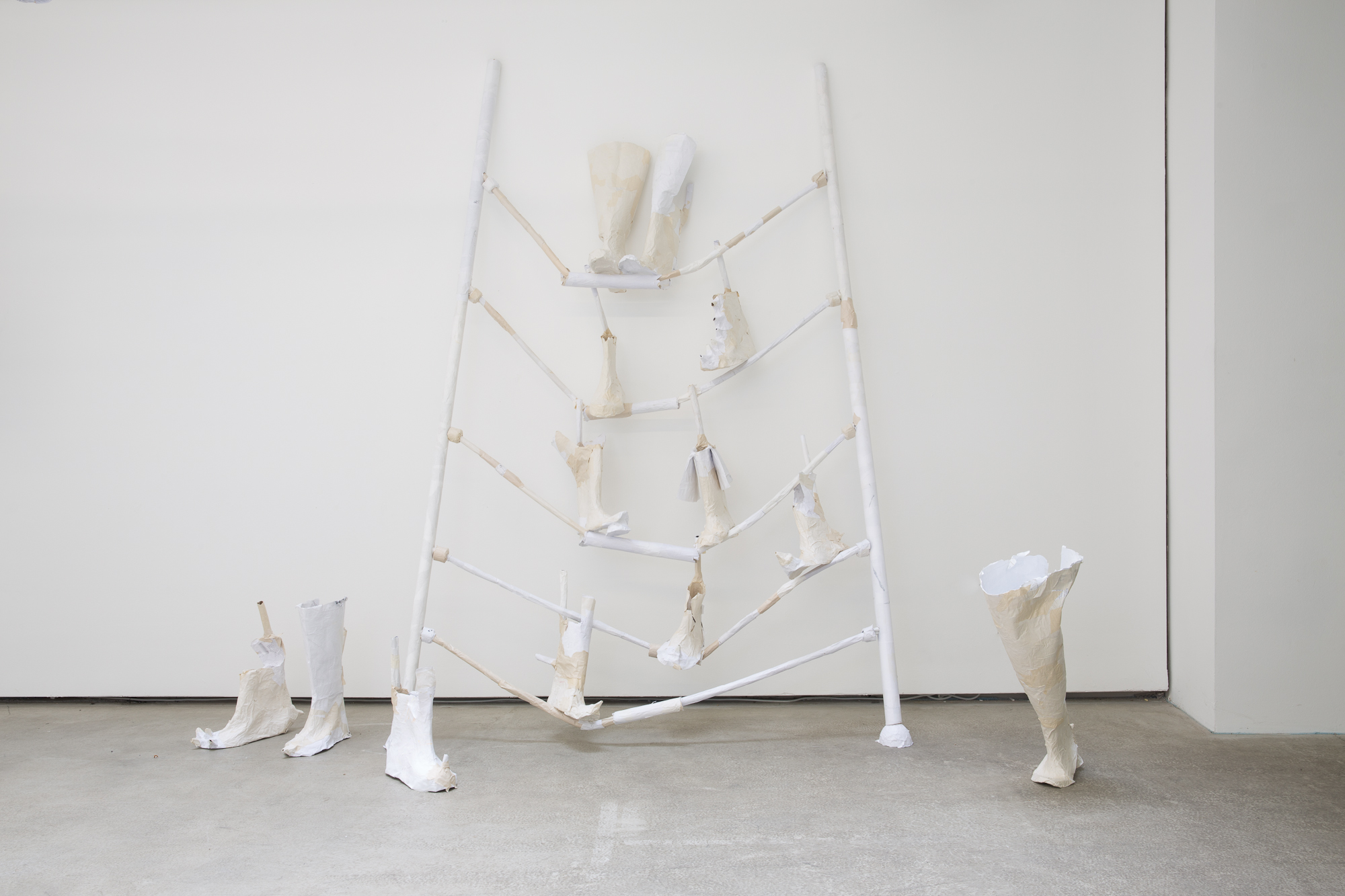 2014(Installation at Franz Joseph Kai Gallery, Vienna, Austria) Newsprint, recycled texts, photocopies of ink drawings, papier-mâché, cardboard. Dimensions variable. The carousel’s radial symmetry acts as a focal point for a variety of actions and events to unfold--similar to early gymnasiums--where bodies bend and flex to “shed skin” and mold into what is imagined as a “more desirable” version of self. The Carousel holds hanging helmets instead of horses. Inside the helmets are fragmented drawings of figures exercising and training.