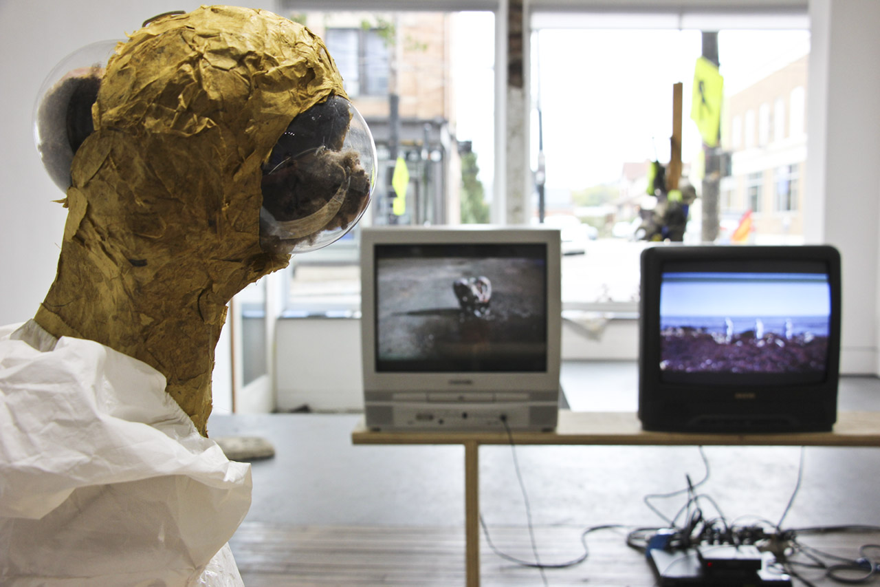 Papier-machet, Tyvek, fake teeth, fake eyelashes, sculpey, plastic, wire, wood. Tv monitors, headphones, wooden bench.